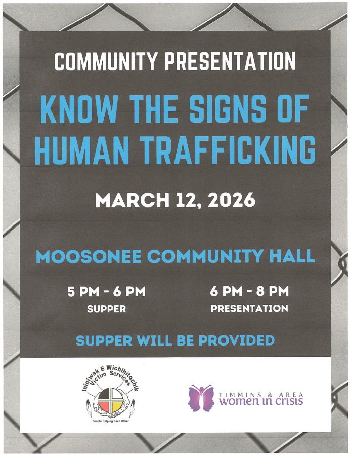 Ininiwak E Wichihitochik Victim Services and Timmins & Area Women in Crisis is jointly hosting a series of presentations in Moose Factory and Moosonee to discuss the signs of human trafficking.